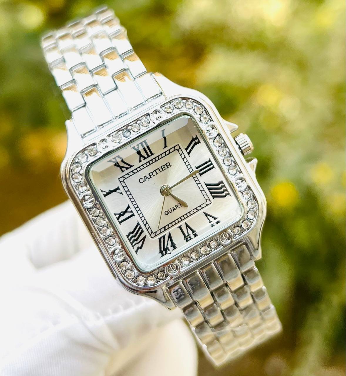ساعة كارتيه بتصميم فاخر يجمع بين الأناقة والكلاسيكية. تأتي الساعة بإطار مرصّع بفصوص جذابة