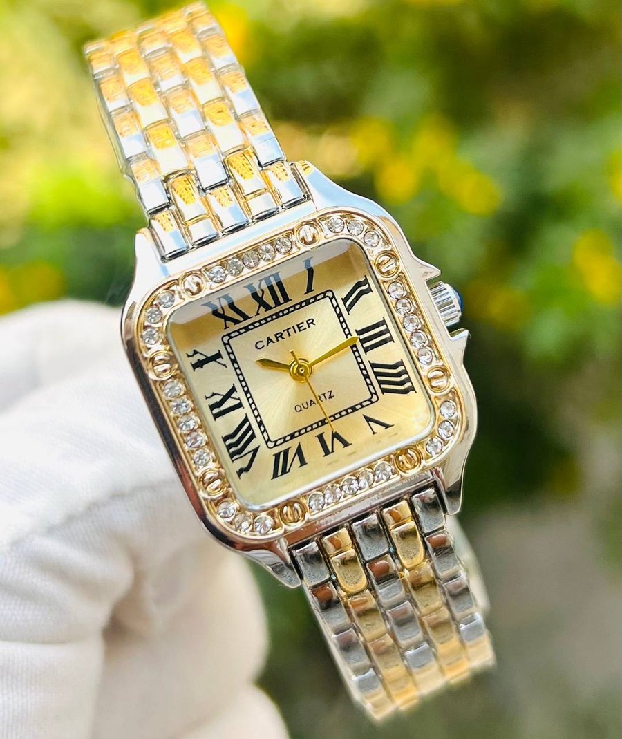ساعة كارتيه بتصميم فاخر يجمع بين الأناقة والكلاسيكية. تأتي الساعة بإطار مرصّع بفصوص جذابة