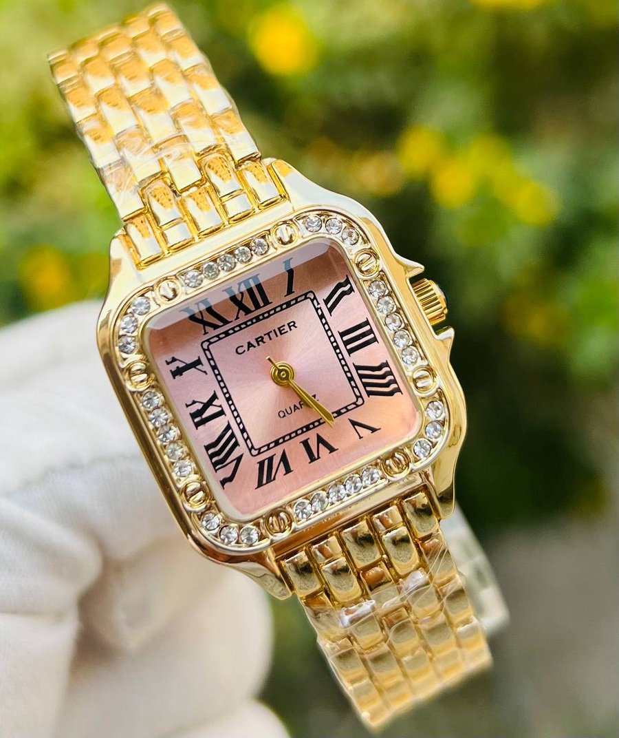 ساعة كارتيه بتصميم فاخر يجمع بين الأناقة والكلاسيكية. تأتي الساعة بإطار مرصّع بفصوص جذابة