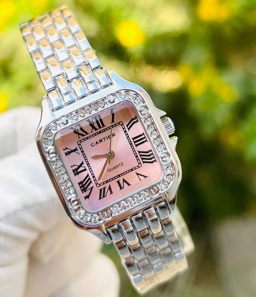 ساعة كارتيه بتصميم فاخر يجمع بين الأناقة والكلاسيكية. تأتي الساعة بإطار مرصّع بفصوص جذابة