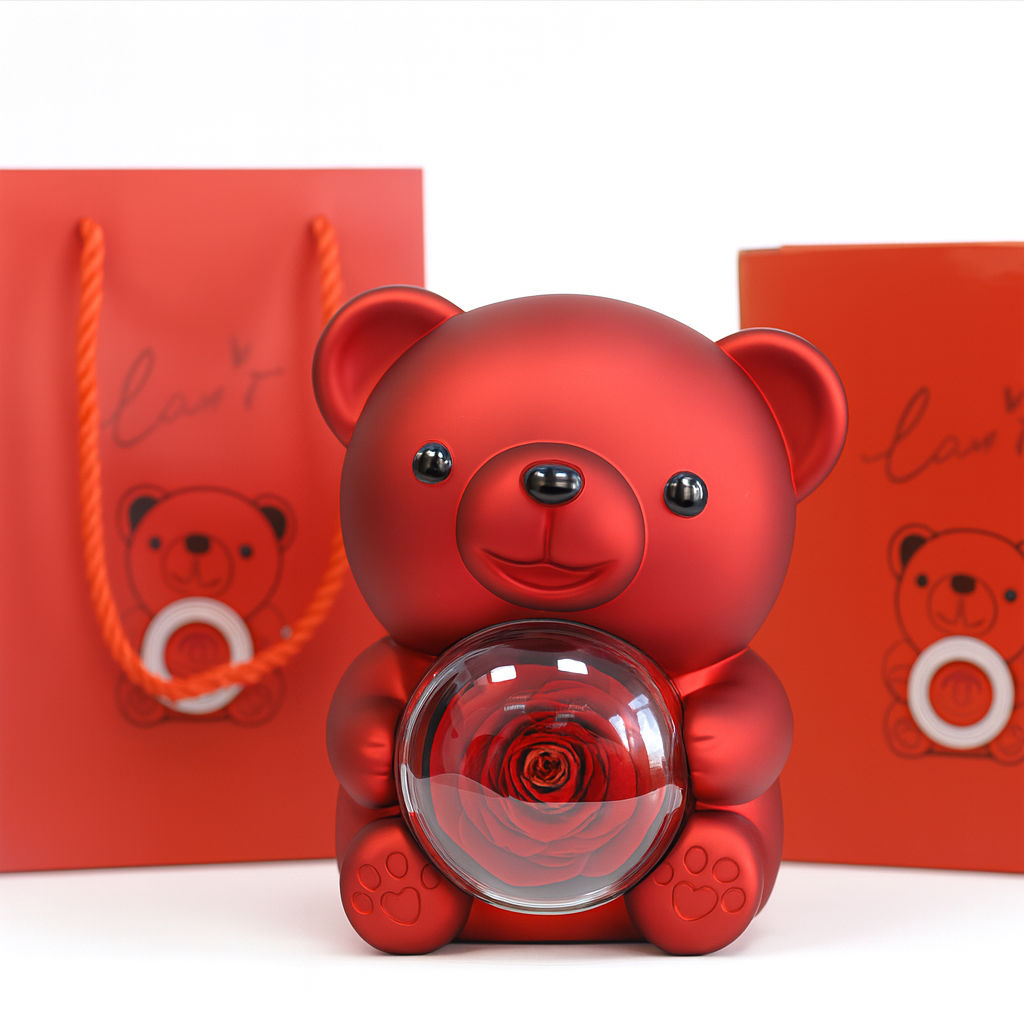 تحفة ديكورية أنيقة باللون الأحمر المطفى، على شكل دبدوب لطيف يحتضن كرة زجاجية بداخلها وردة حمراء مجسمة نابضة بالحياة.